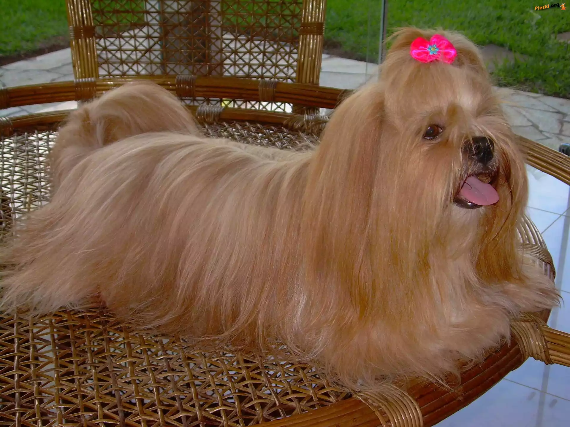 Pies, Różowa, Gerbera, Lhasa Apso Lana Del Rey, Pies, Lhasa Apso Lhasa Apso, kokardka Malutki piesek, Lhasa Apso wyczesany, Lhasa Apso