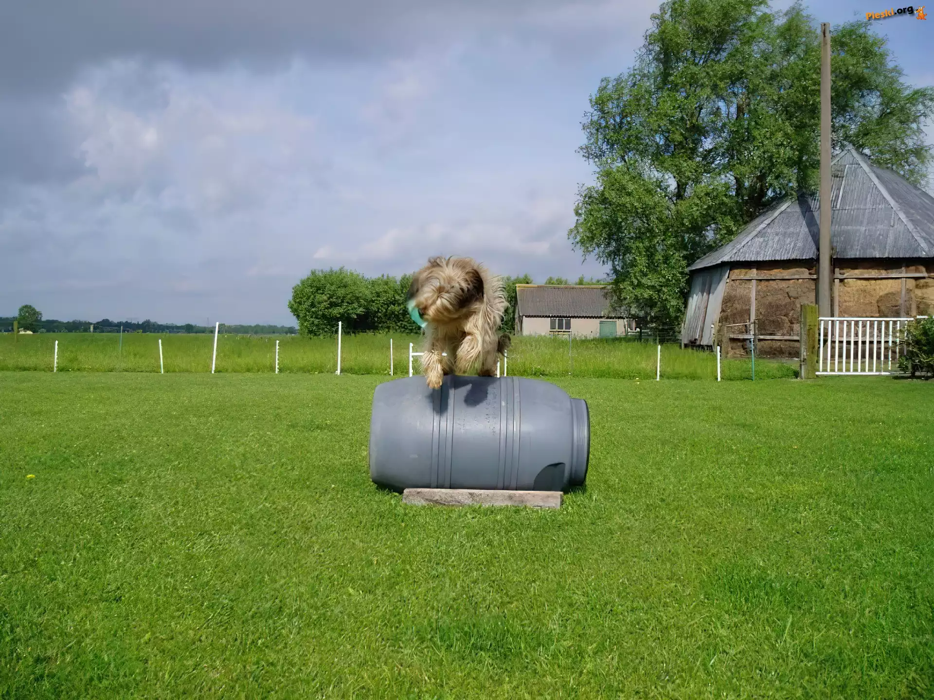beczka, Owczarek kataloński, trawa, szopa, Pieski