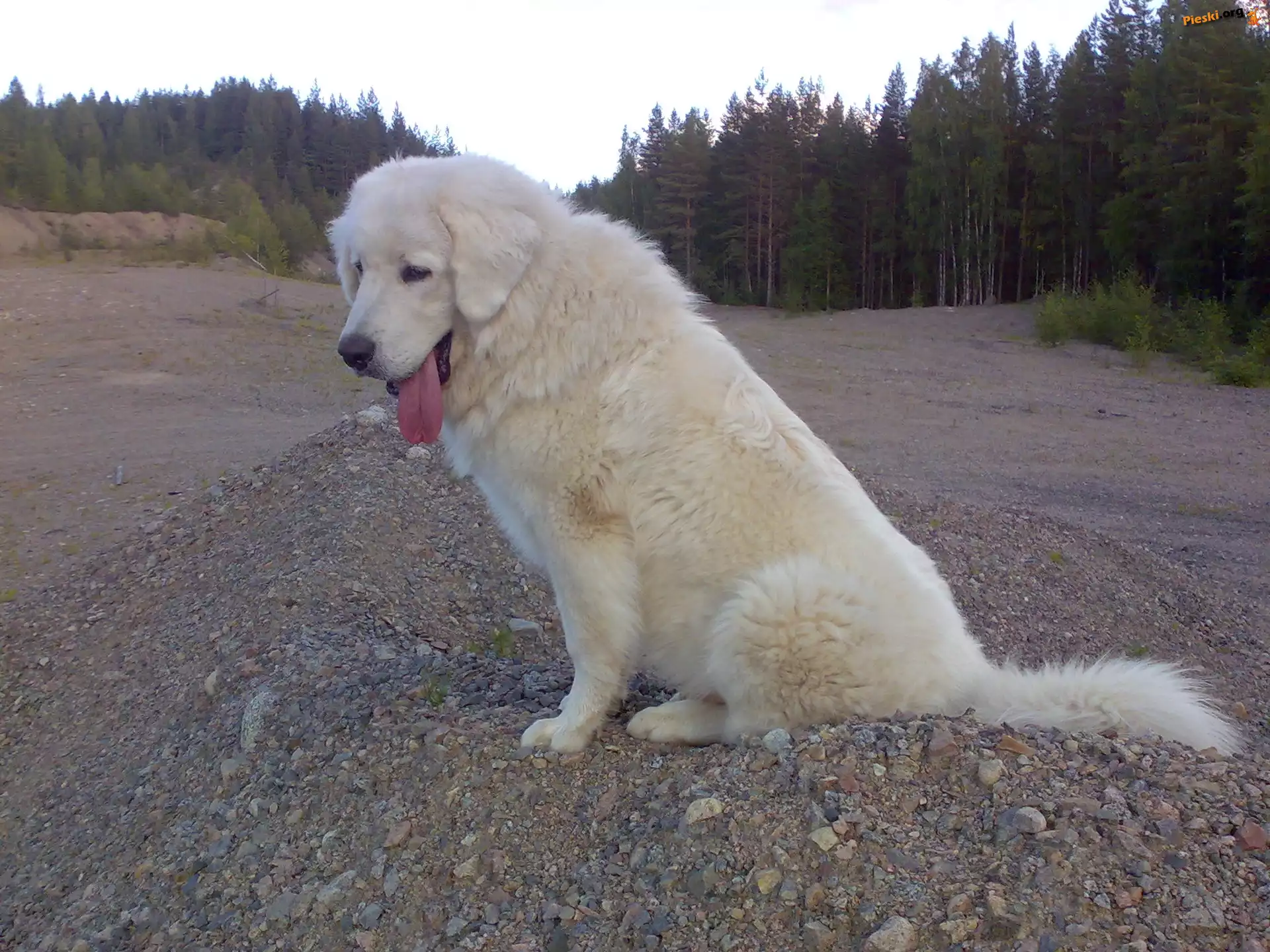 Trawa, Dwa, Pieski, Niebo skórzana, Głowa, Owczarka podhalańskiego, obroża Pies, Owczarek Podhalański Owczarek podhalański, zielona, trawa Mordka, Polskiego owczarka podhalańskiego Biały, mały, piesek Biały, Polski owczarek podhalański, język czerwona, Owczarek podhalański, zęby, obroża
