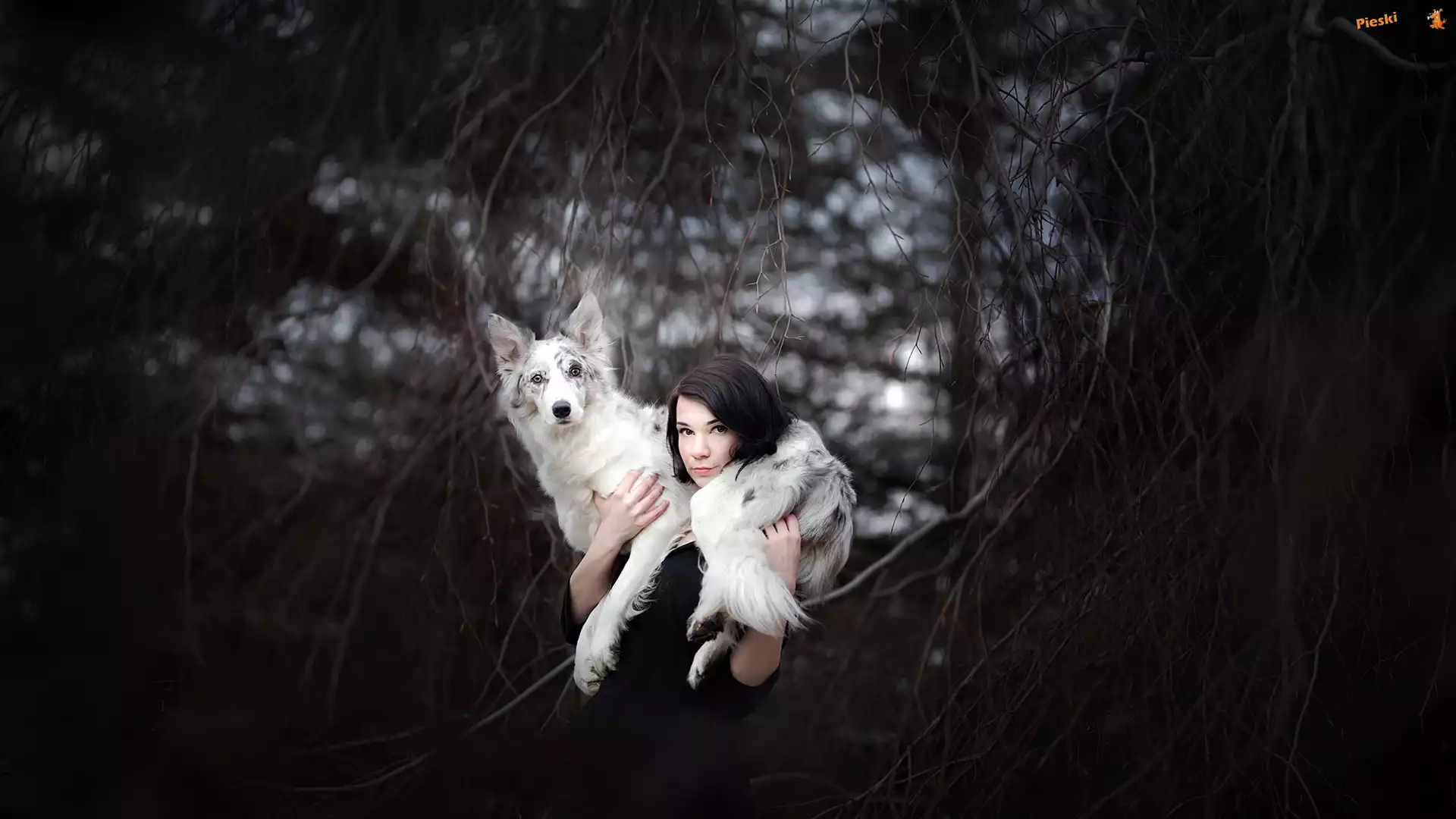 Border collie, Kobieta, Pies, Gałęzie, Pieski