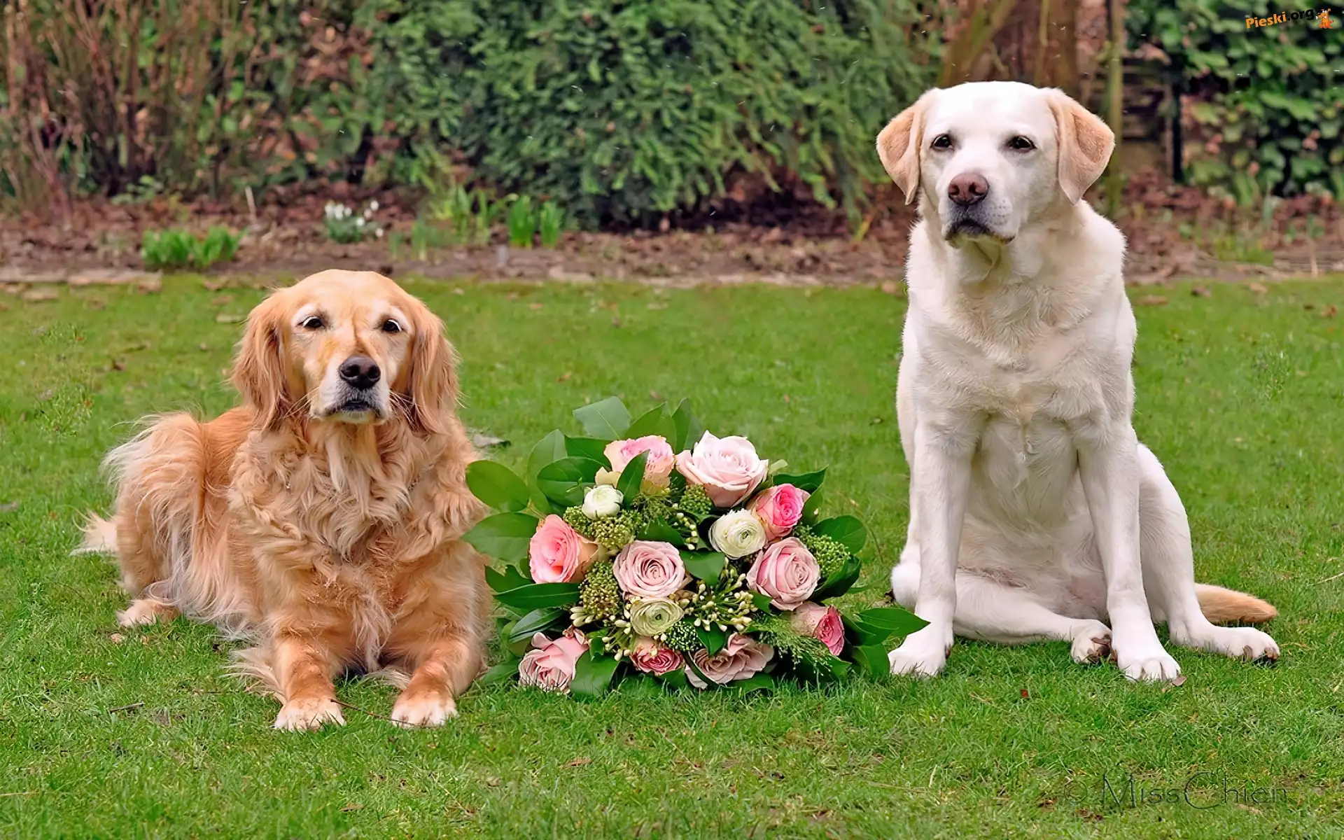 Dwa, Bukiet, Labrador retriever, Psy, Golden retriever, Róż