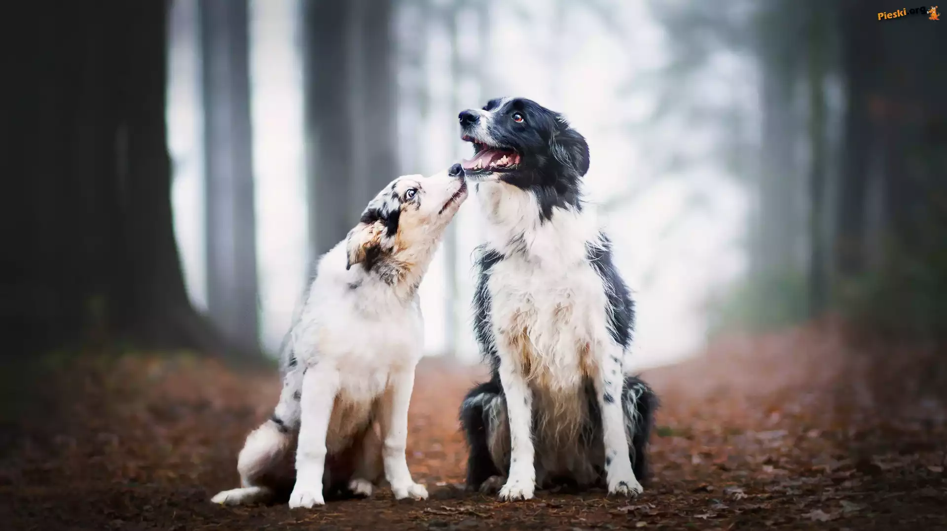 Dwa, Dróżka, Las, Psy, Border collie, Liście, Pieski