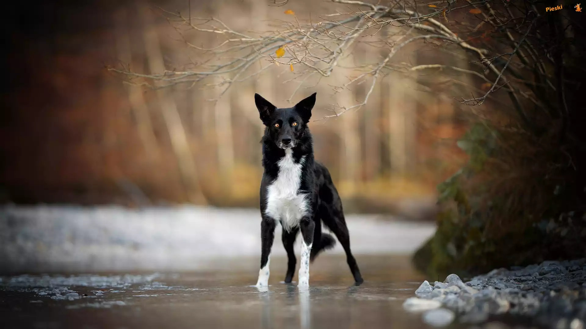 Drzewa, Border collie, Pies, Rzeka, Gałązki