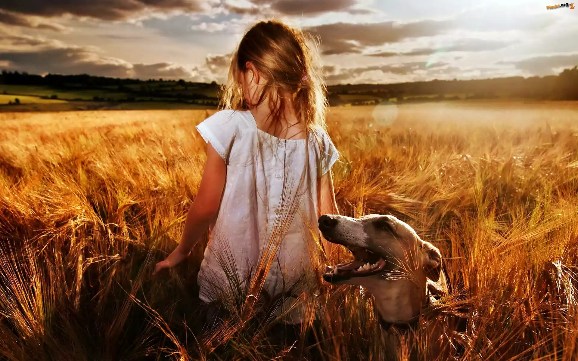 Dziewczynka, Zachód, Chmury, Chart, Pole, Słońca Pies, Oczy, Pysk