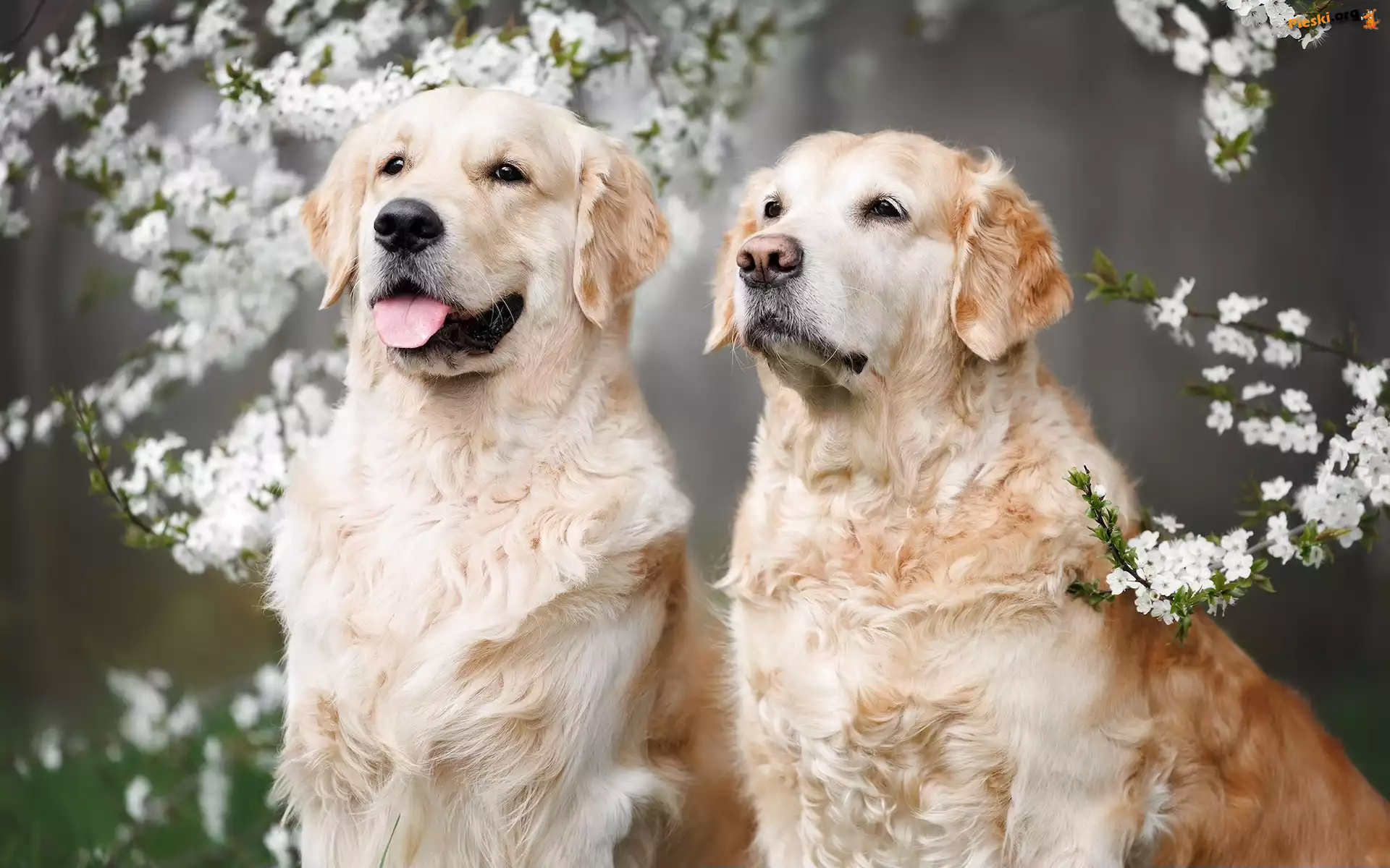 Dwa, Kwiaty, Psy, Gałązki, Golden retriever