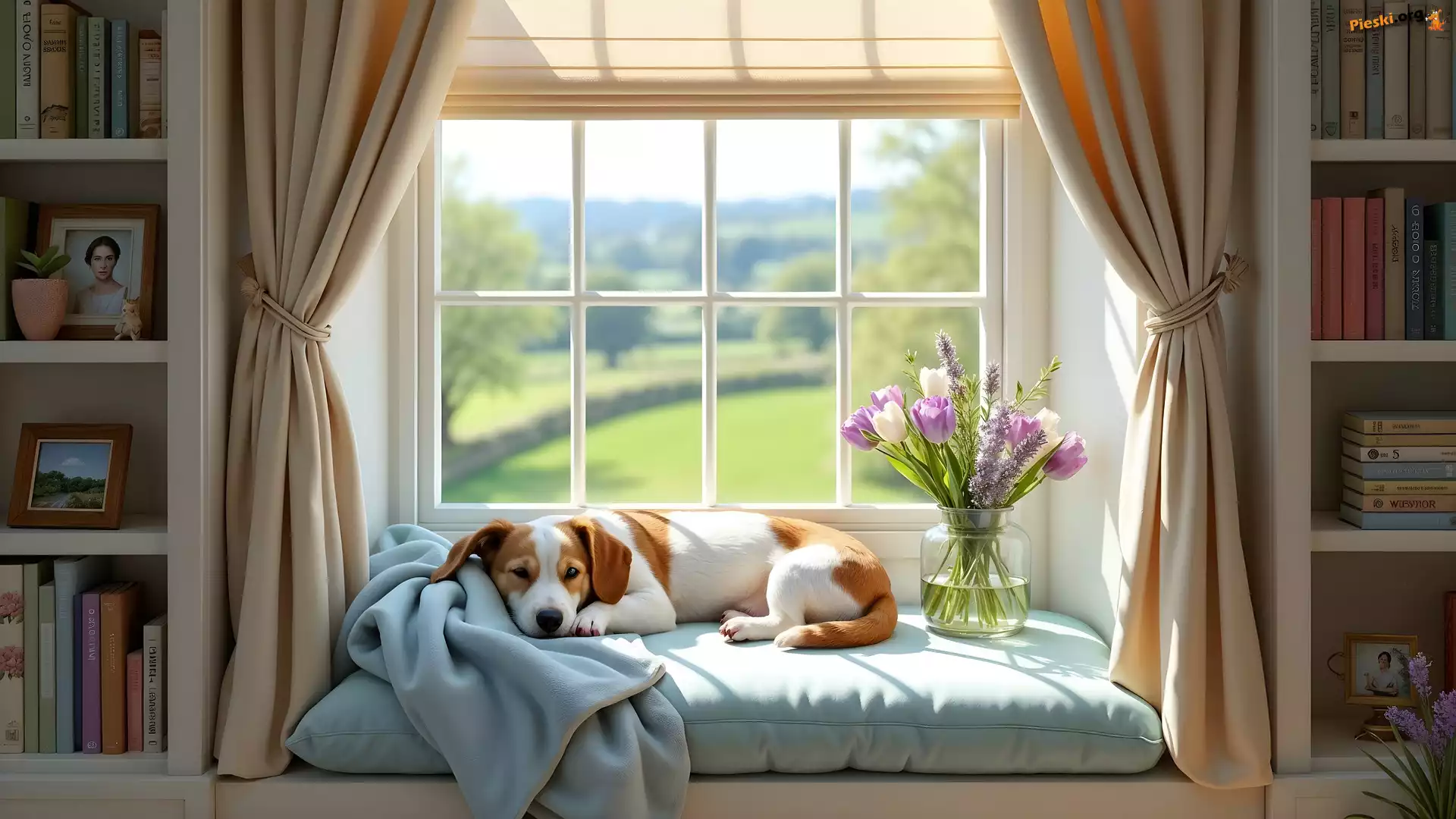 Kwiatów, Bukiet, Regał, Grafika AI, Książki, Okno, Leżący, Pies, Pieski