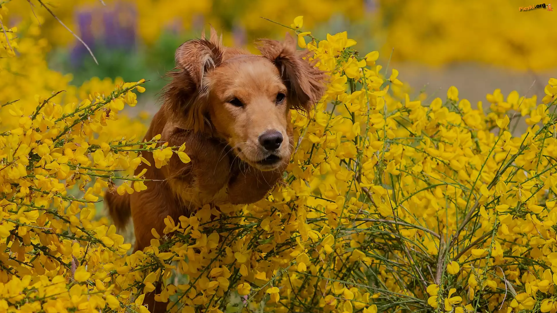 Kwiaty, Pies, Żółte, Rozmycie, Pieski