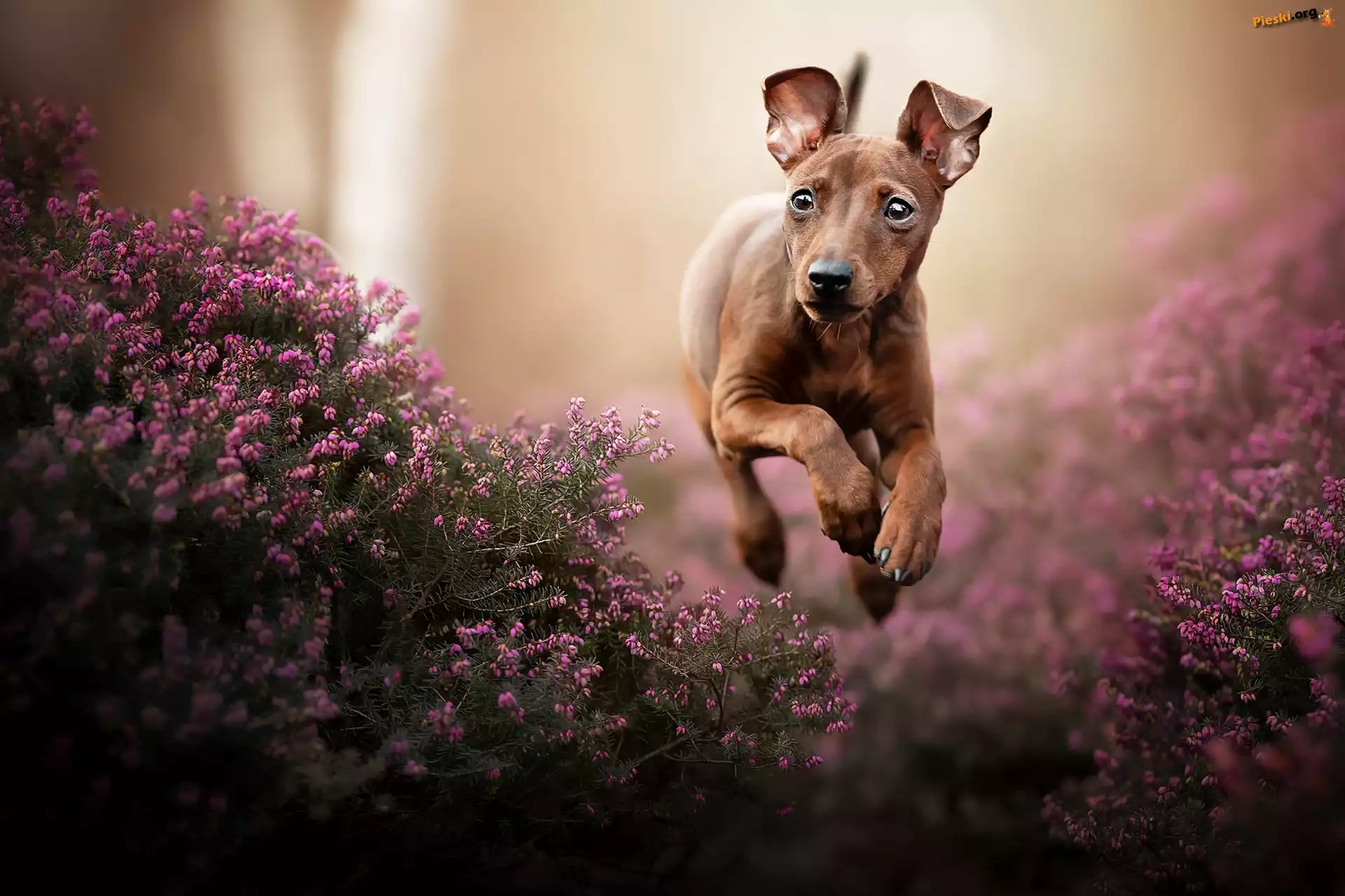 Wrzosy, Kwiaty, Biegnący, Pies, Pieski