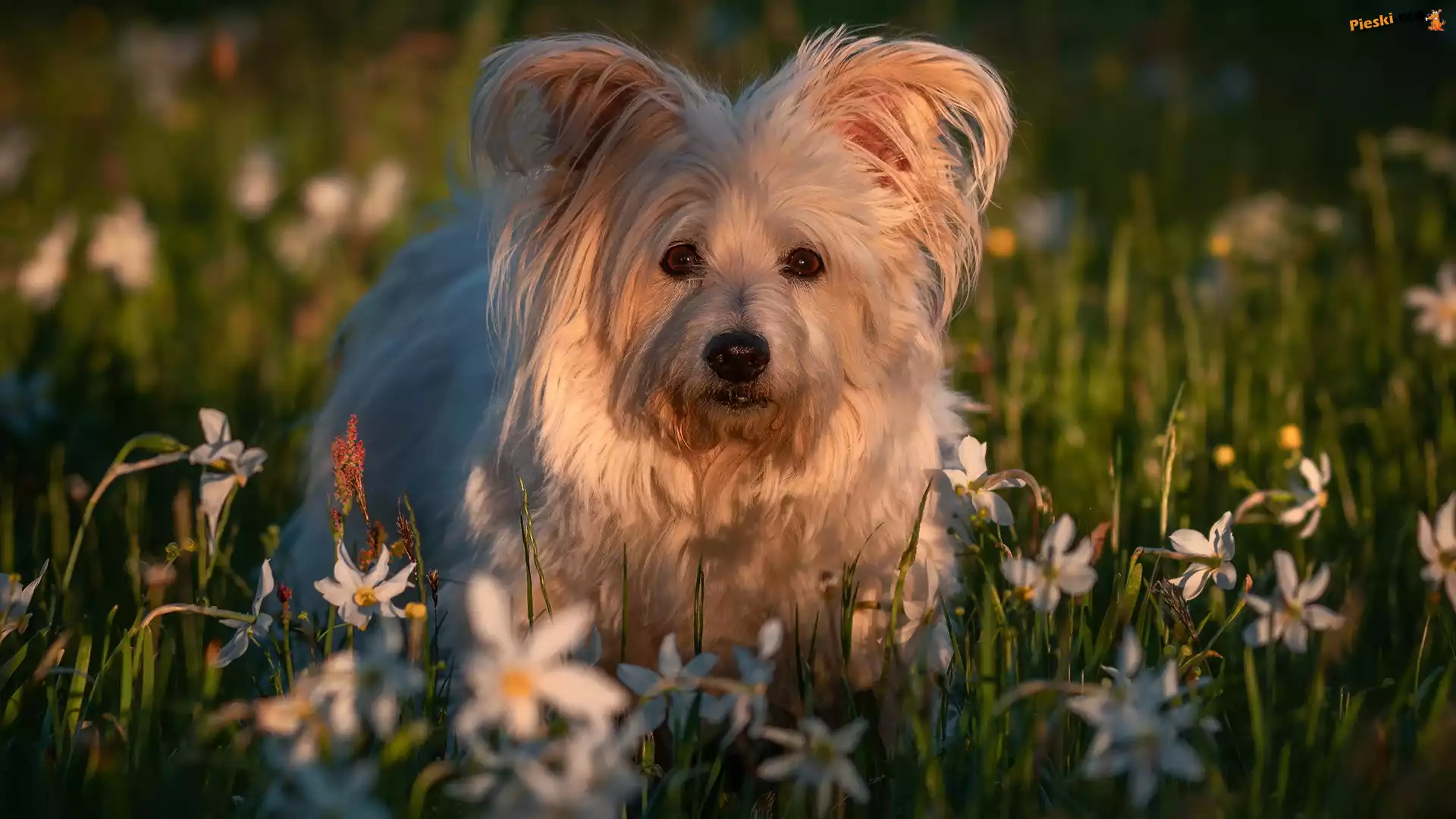 Kwiaty, Pies, Trawa, Narcyzy, Pieski