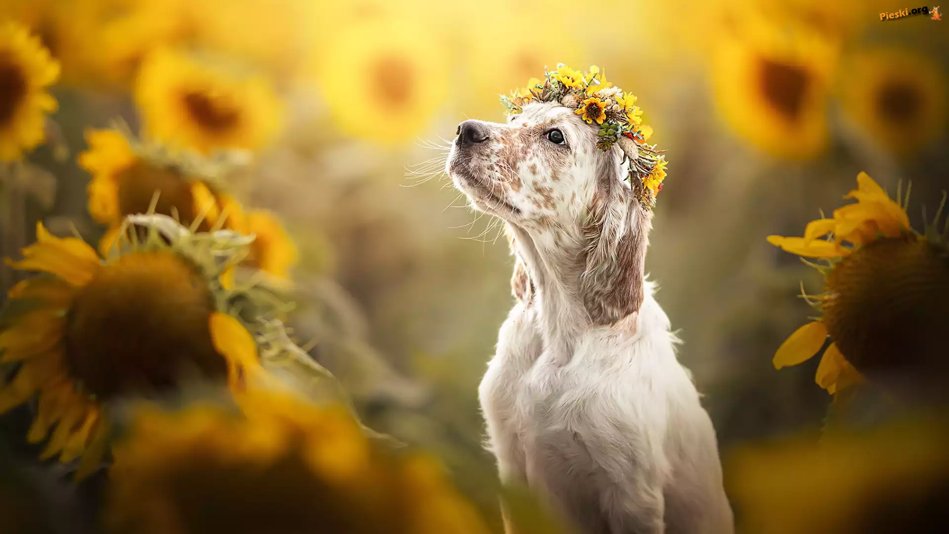 Kwiaty, Pies, Wianek, Słoneczniki, Pieski