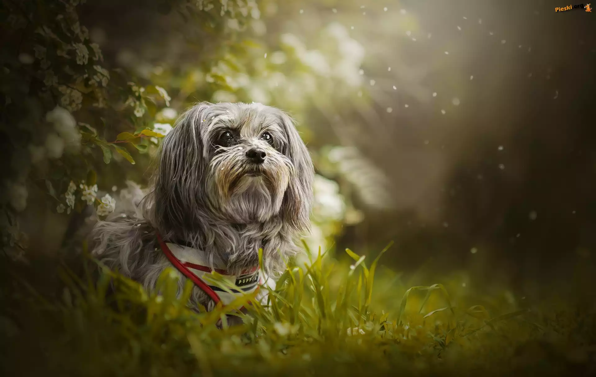 dwa, białe, Lwi pieski Lwi piesek, Trawa, Rośliny Róże, Szary, Piesek Pies, Trawa Głowa, Lwi piesek, Lowchen, Trawa Trawa, Lwi Piesek, Dwa, Szczeniaki