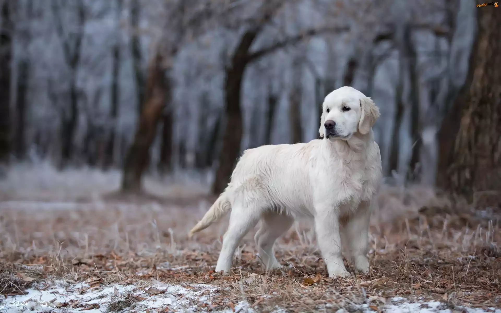 Młody, Golden retriever, Las, Pieski