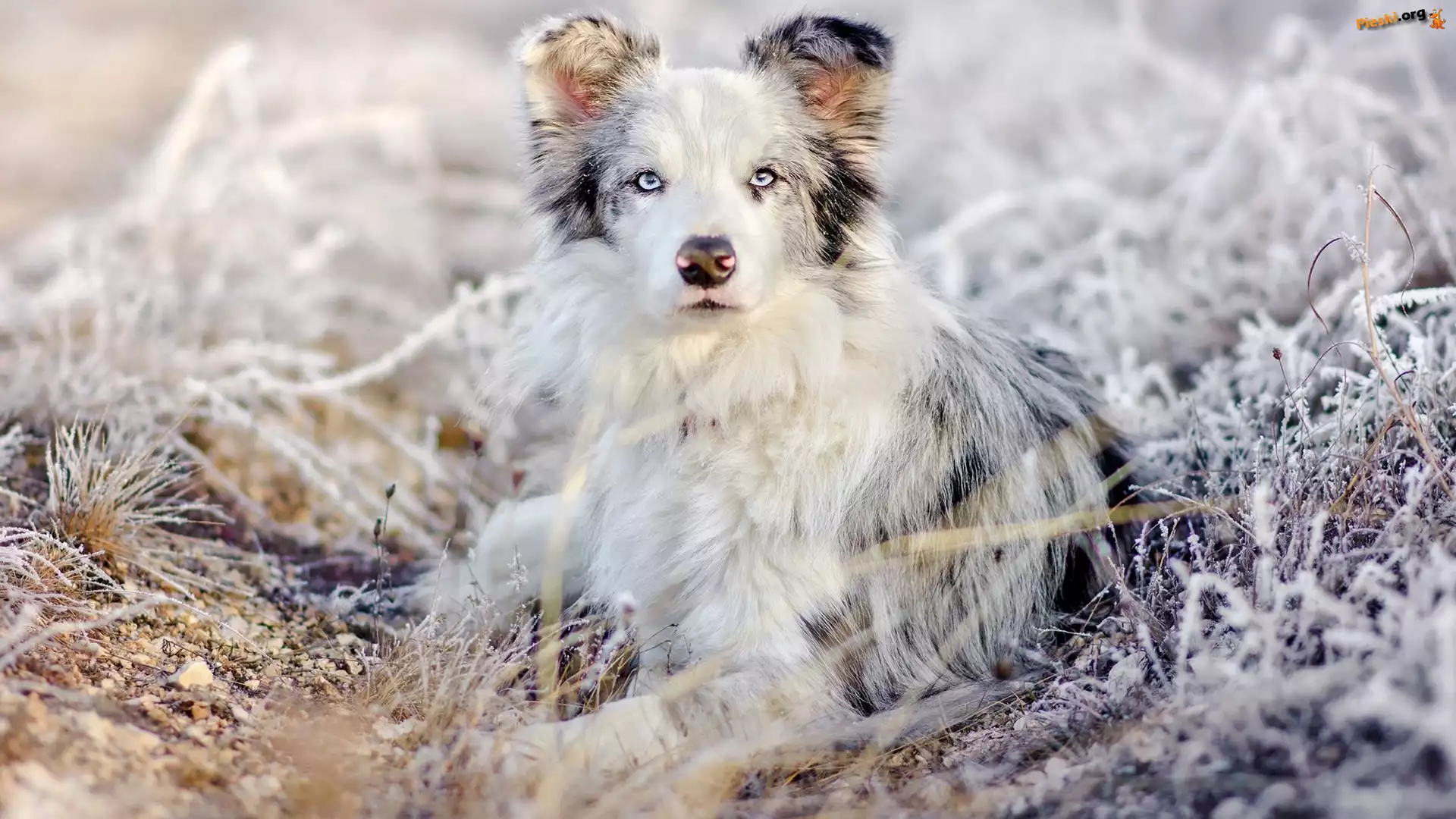 Oszronione, Owczarek australijski, Pies, Trawa, Źdźbła, Pieski