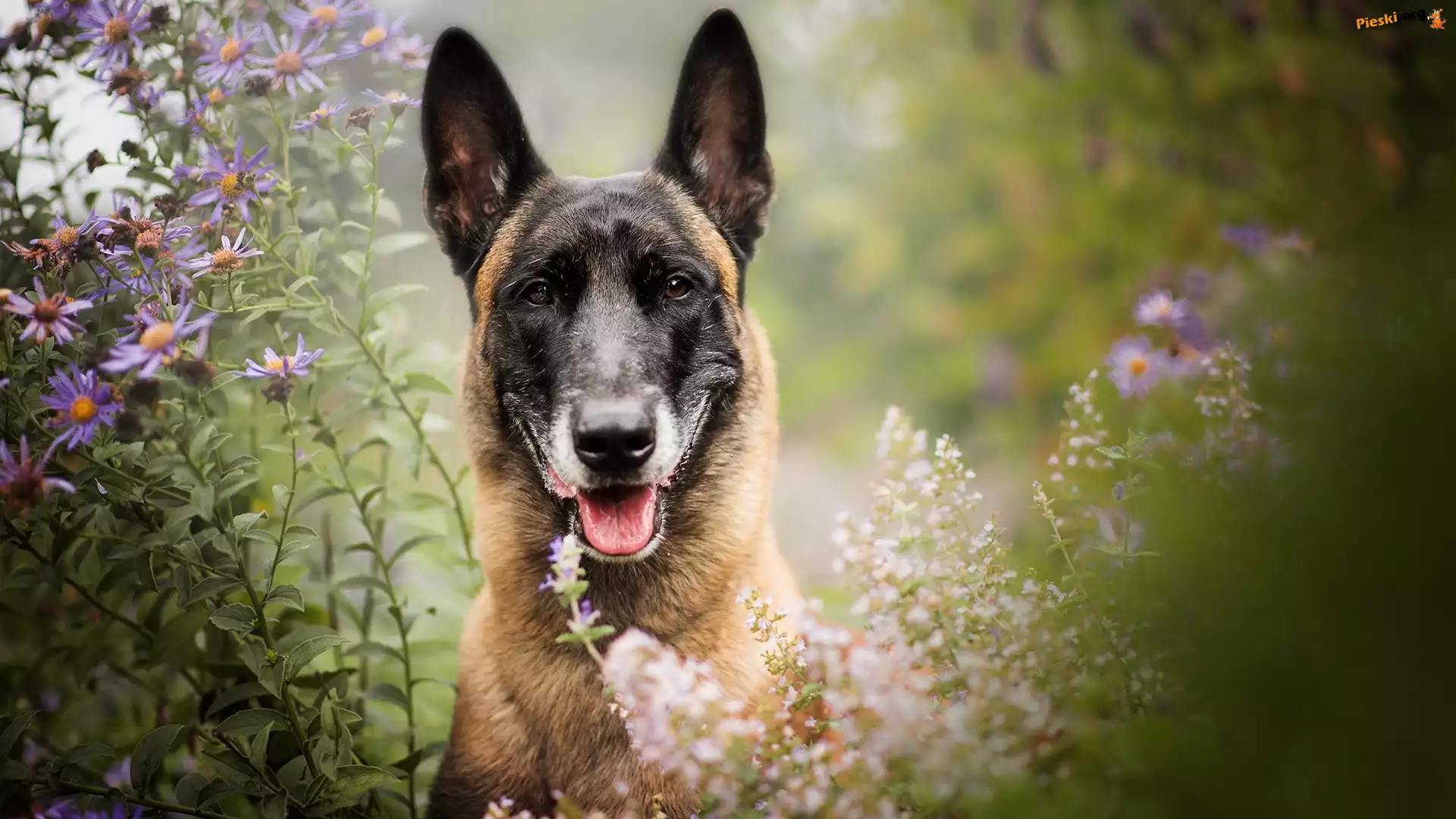 Owczarek belgijski Malinois, Pies, Mordka, Kwiaty, Pieski