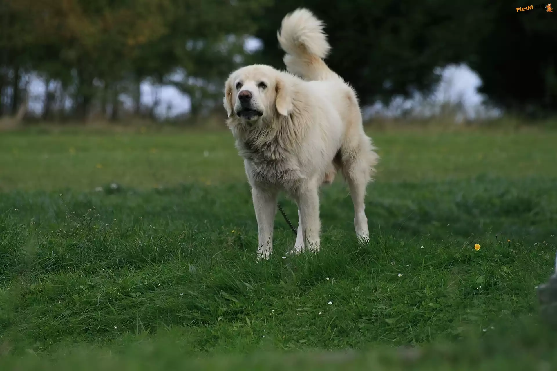 Trawa, Dwa, Pieski, Niebo skórzana, Głowa, Owczarka podhalańskiego, obroża Pies, Owczarek Podhalański Owczarek podhalański, zielona, trawa Mordka, Polskiego owczarka podhalańskiego Biały, mały, piesek Biały, Polski owczarek podhalański, język czerwona, Owczarek podhalański, zęby, obroża