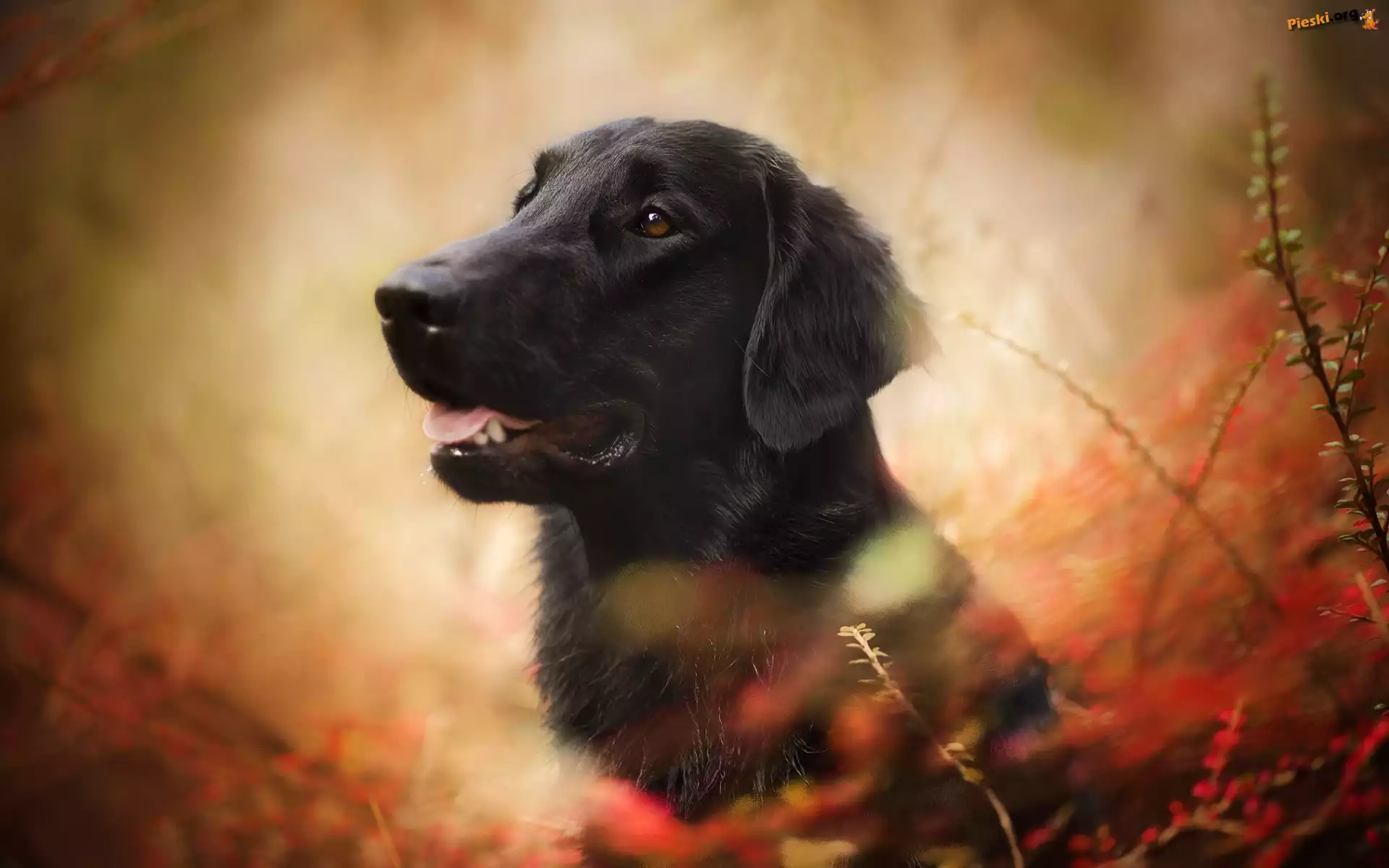 Pies, Flat coated retriever, Gałęzie, Pieski