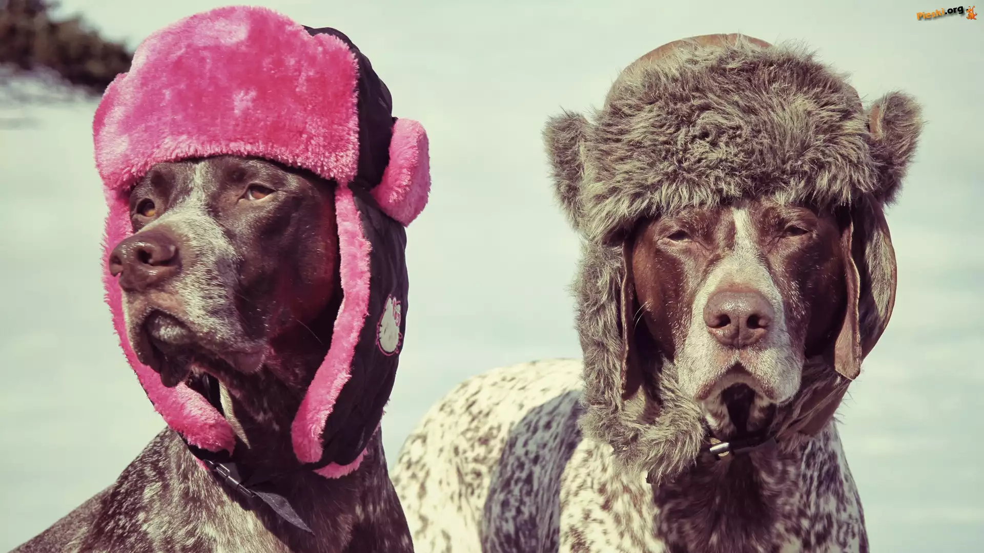 Wyżły niemieckie krótkowłose, Dwa, Psy, Czapki, Pieski