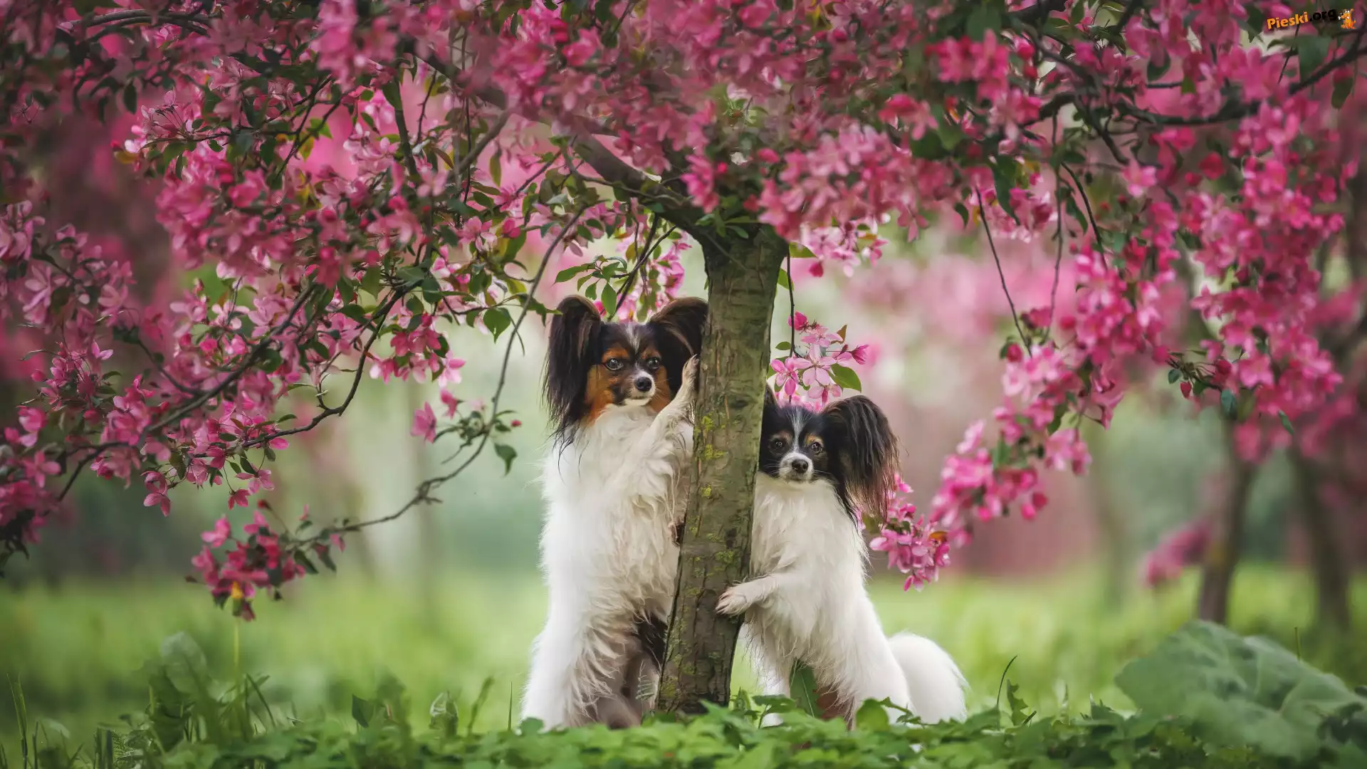 Spaniele kontynentalne miniaturowe Papillon, Drzewo, Dwa, Kwitnące, Psy
