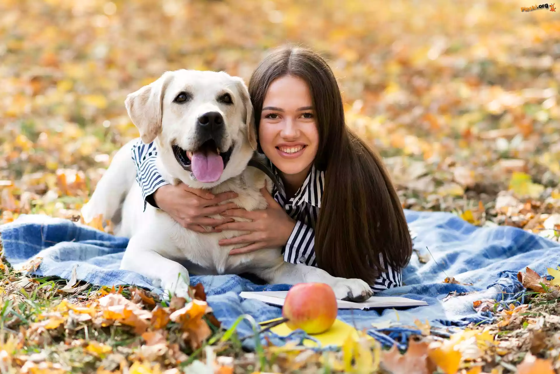 Liście, Kobieta, Biały, Jabłko, Długowłosa, Pies, Labrador retriever, Pieski