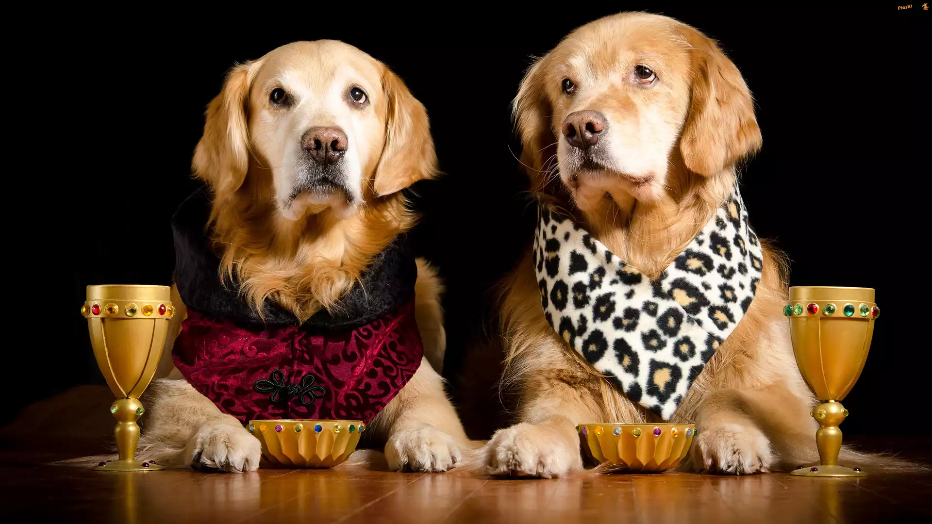 Kieliszki, Psy, Golden retriever, Dwa, Miski, Ubranko, Pieski