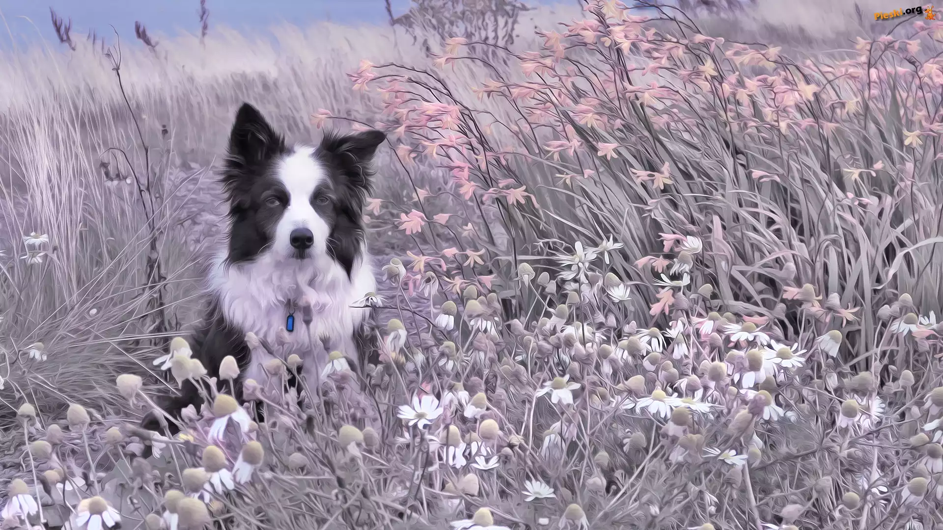 Pies, Rośliny, Kwiaty, Border collie, Łąka, Trawy
