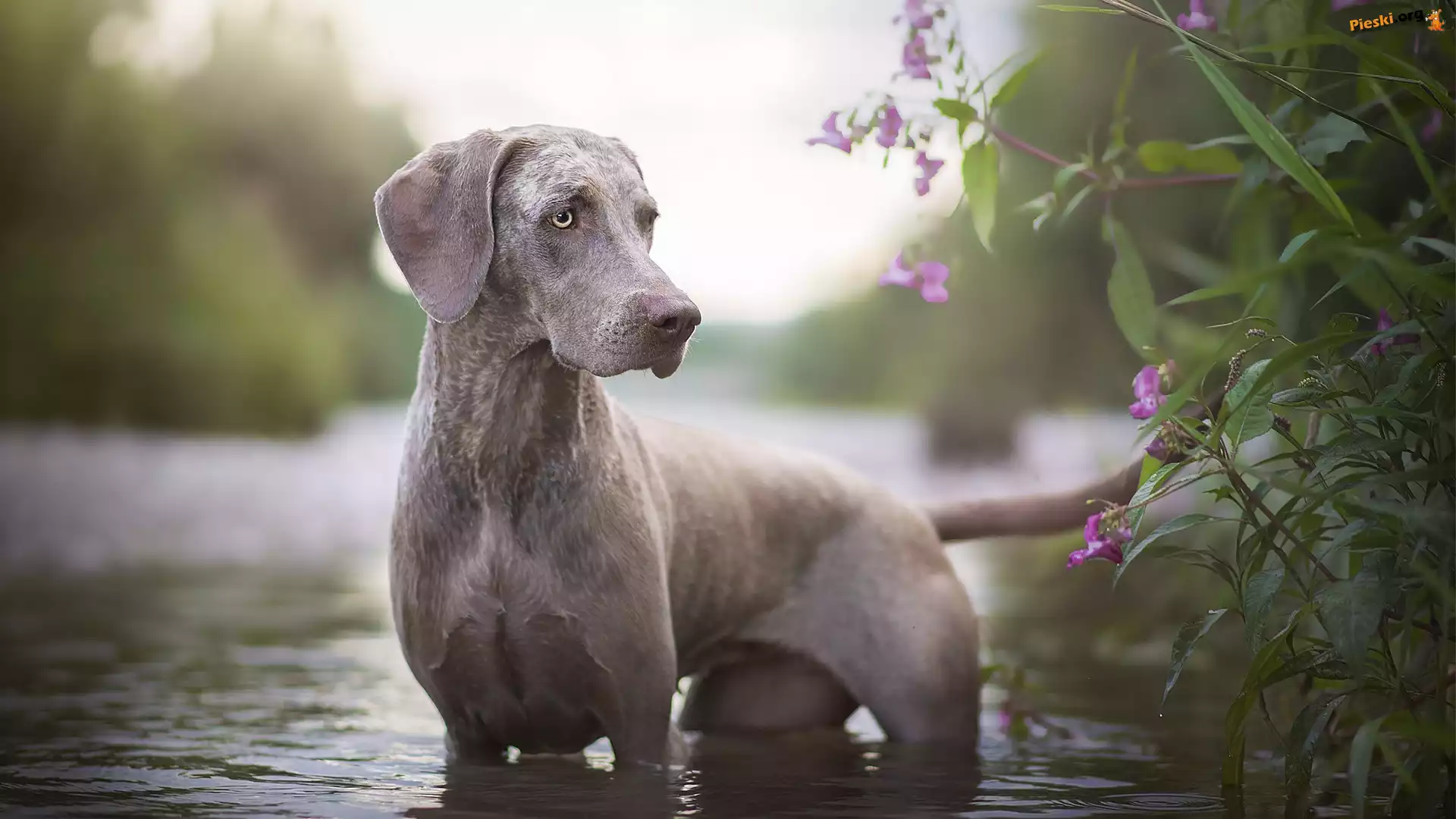 Rośliny, Wyżeł weimarski, Pies, Woda, Kwiatki, Pieski