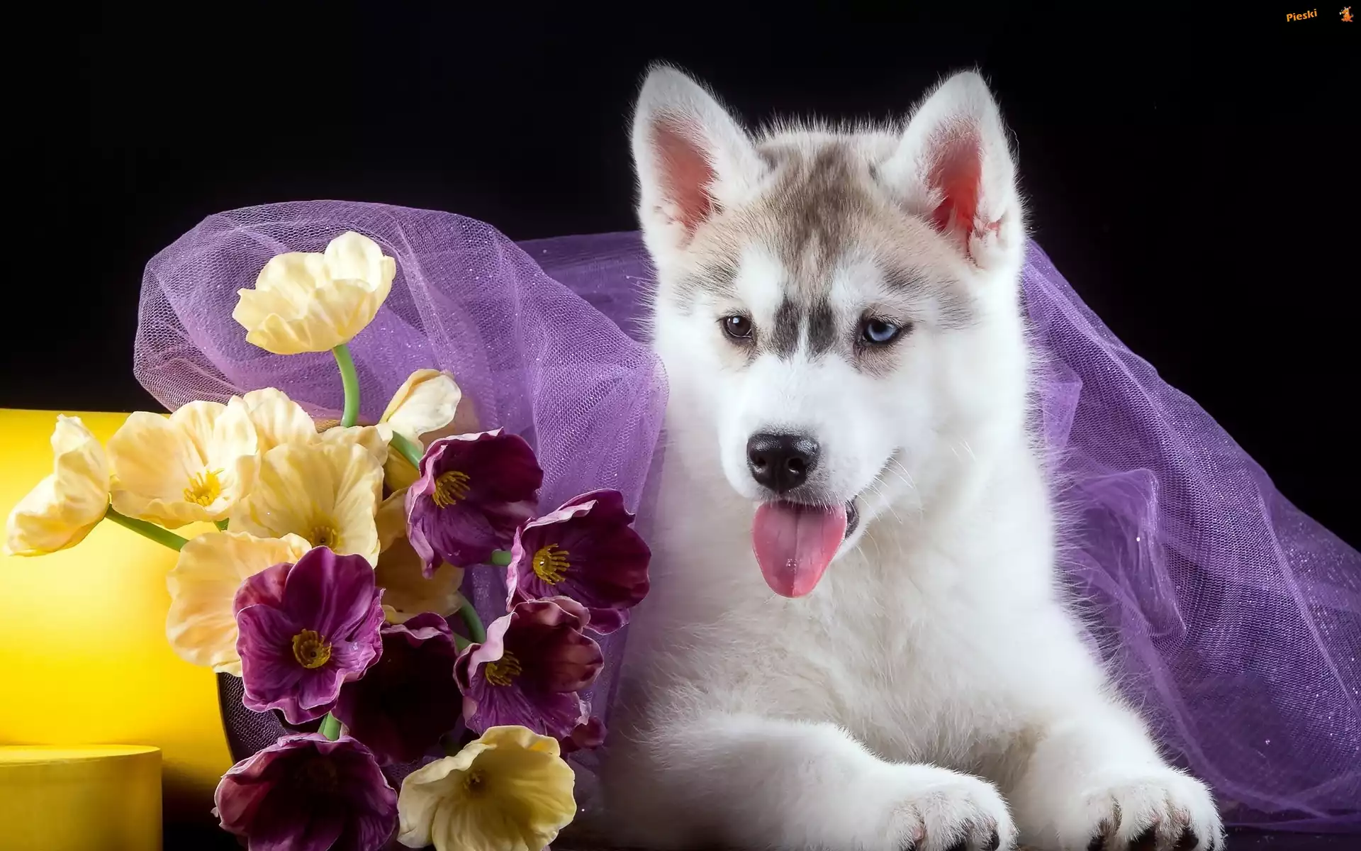 Siberian Husky, Szczeniak, Kwiatki, Pieski