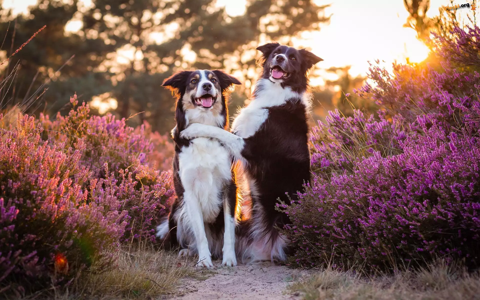 Światło Słoneczne, Psy, Border collie, Dwa, Światło słoneczne, Wrzos, Pieski