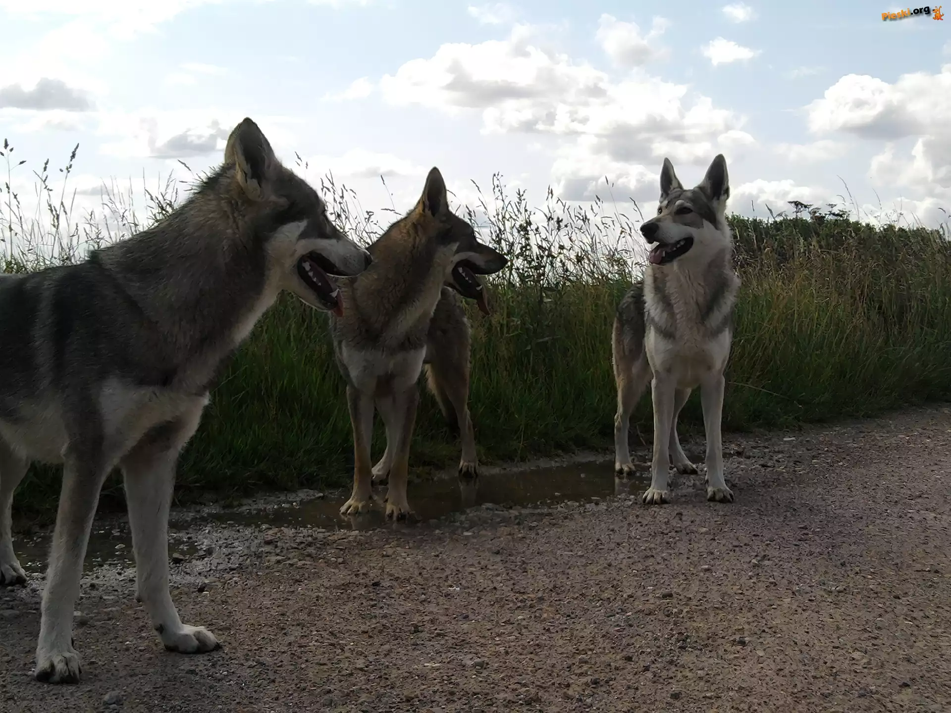 trzy, Saarlooswolfhond Saarlooswolfhond, woda Saarlooswolfhond, uszy, postawione Saarlooswolfhond, śnieg, krzaki