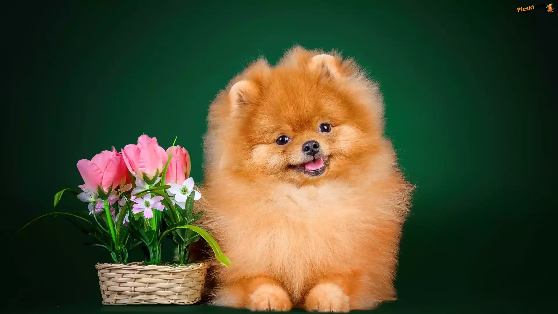 Piesek, Pomeranian, Tulipany, Szpic miniaturowy, Koszyk, Pieski