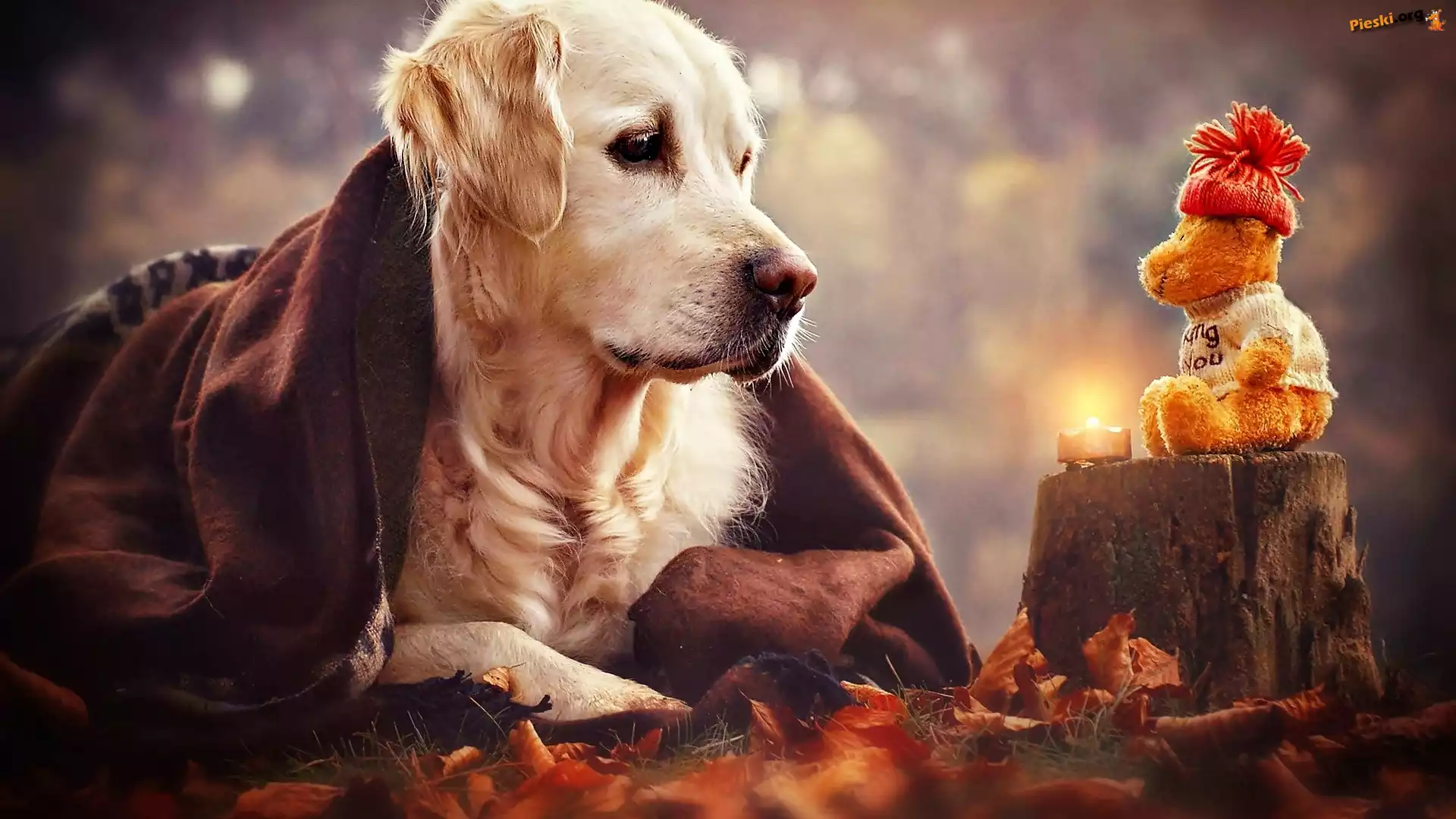 Pies, Świeczka, Miś, Golden retriever, Zabawka, Pień, Pieski