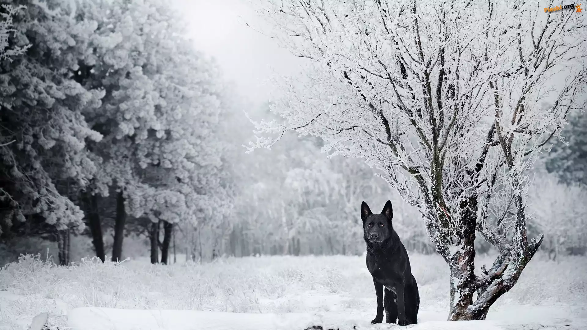 Zima, Pies, Czarny owczarek niemiecki, Drzewa, Pieski